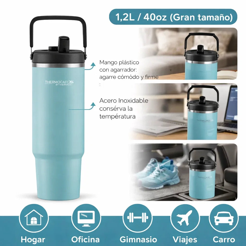 Mug Térmico Acero Inoxidable 1.2 litros con Tapa doble función + Mango Plástico Azul cielo