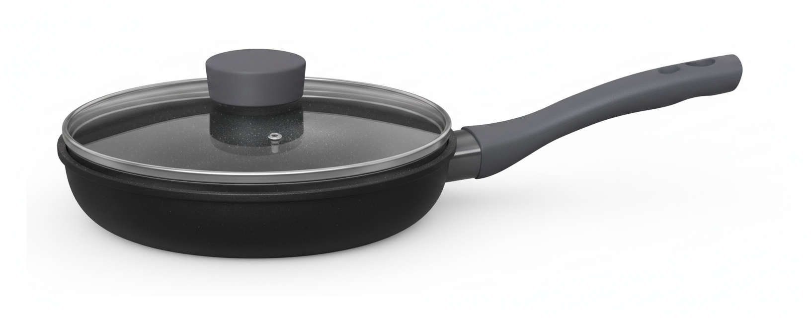 La sartén Grey de 24 cm con tapa está elaborada en aluminio forjado de alta resistencia, permitiendo una distribución uniforme del calor para lograr preparaciones más homogéneas y eficientes.