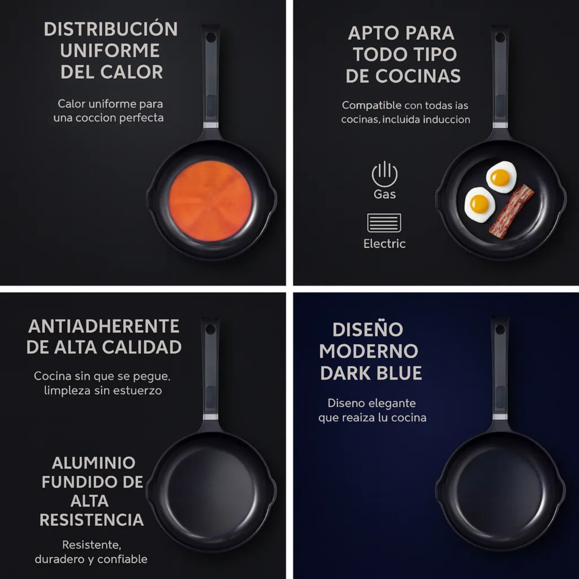 Cocina con potencia, control y estilo. Este set de sartenes en aluminio fundido ofrece calor uniforme, antiadherencia superior y un diseño moderno que eleva tus recetas al siguiente nivel, todos los días.