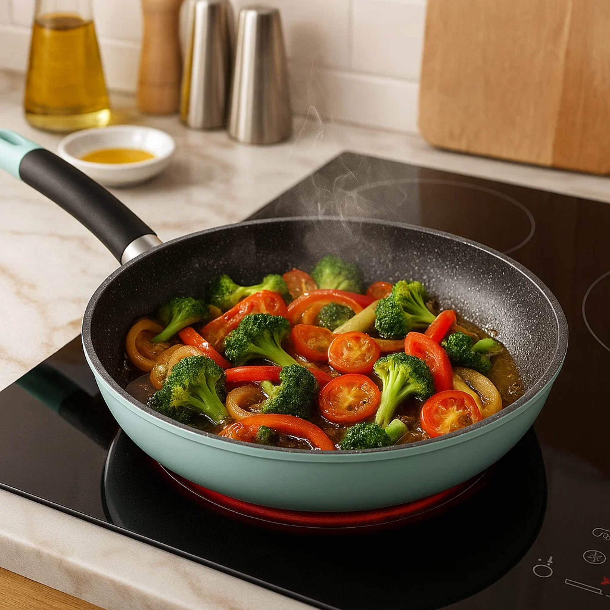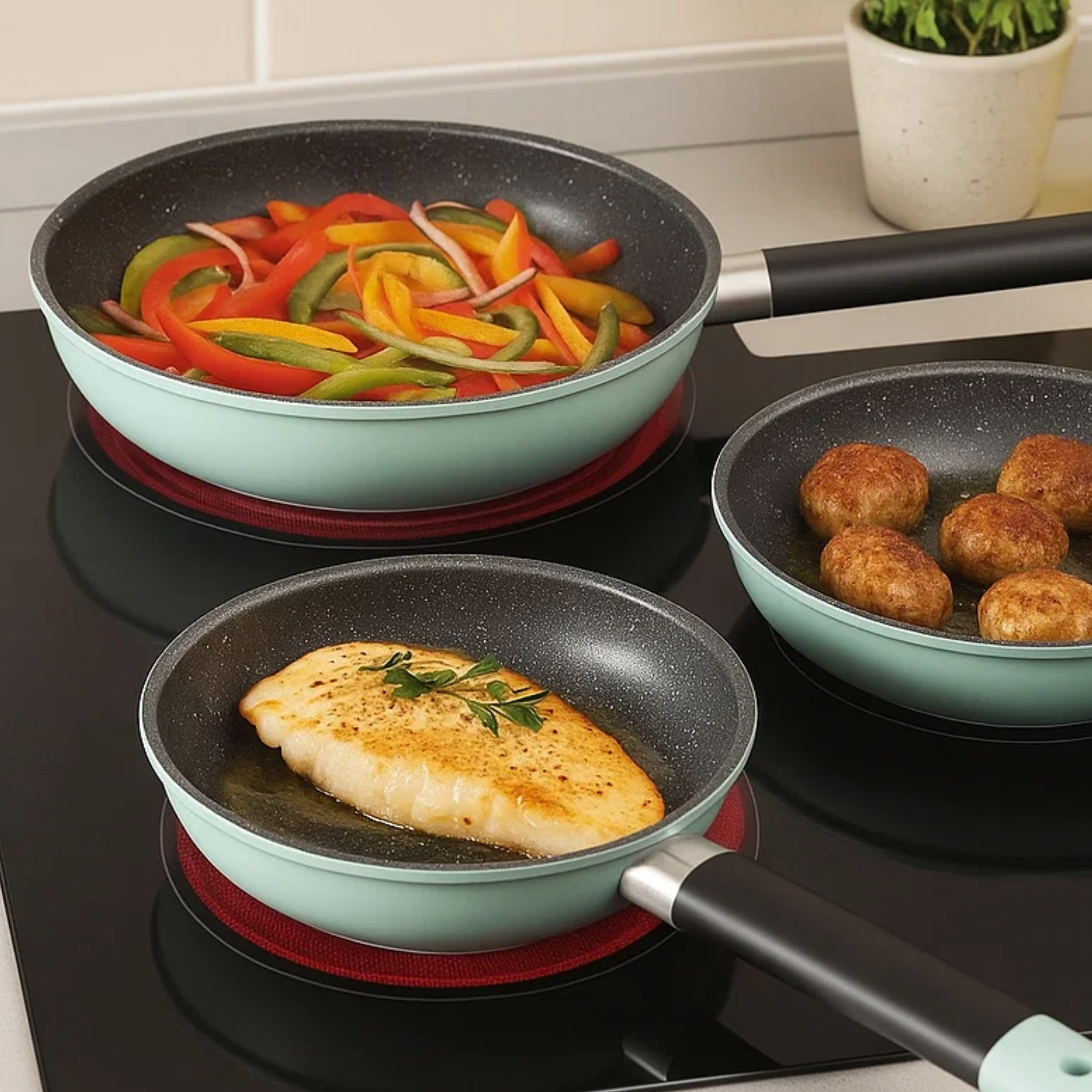 El set de sartenes Soho Mint combina diseño moderno y alto rendimiento para transformar tu experiencia en la cocina. Su elegante color mint pastel aporta estilo y frescura, mientras que su construcción en aluminio forjado ofrece una mayor durabilidad y distribución uniforme del calor.
